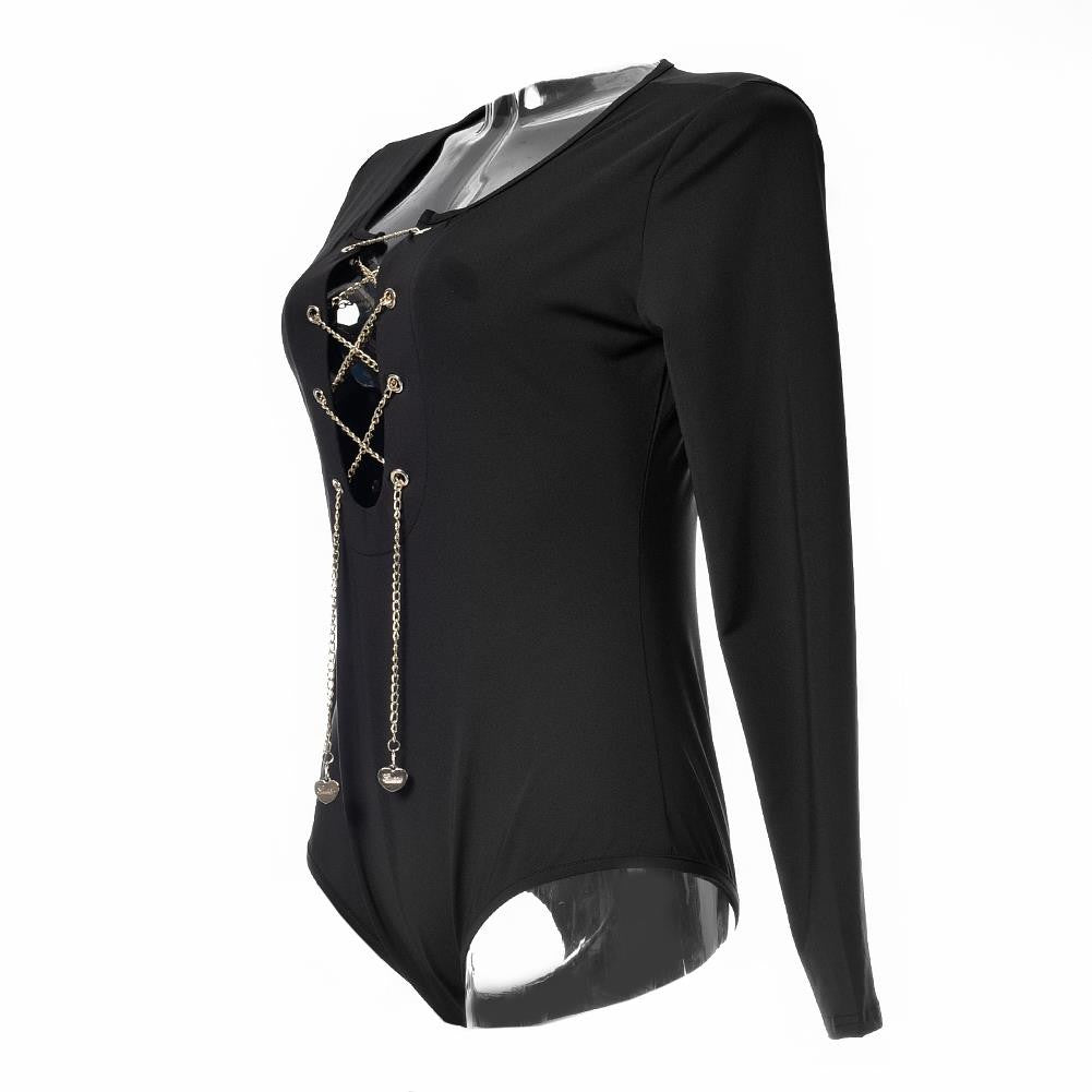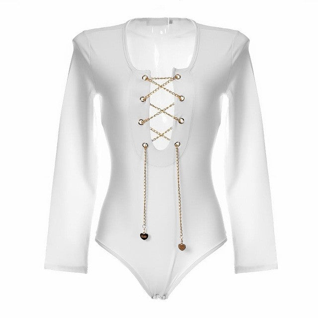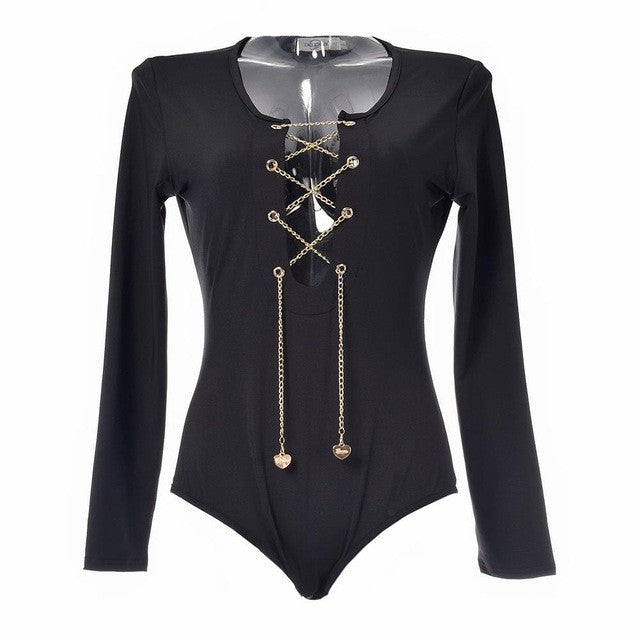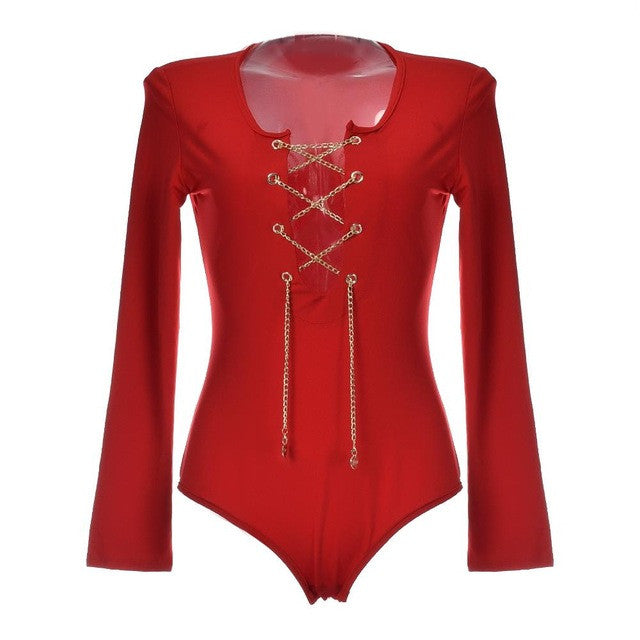 Autumn Lace Up Bodysuit Sexy Black Red White Long Sleeve Women Jumpsuit Bodysuits Overalls White Gold Chain tie up cross criss