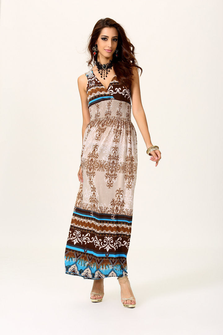 Back Crochet Flower Pattern Boho Tribal Print Floral Striped Bohemian Summer Longuette For Vacation Women Long Maxi Dress Beach