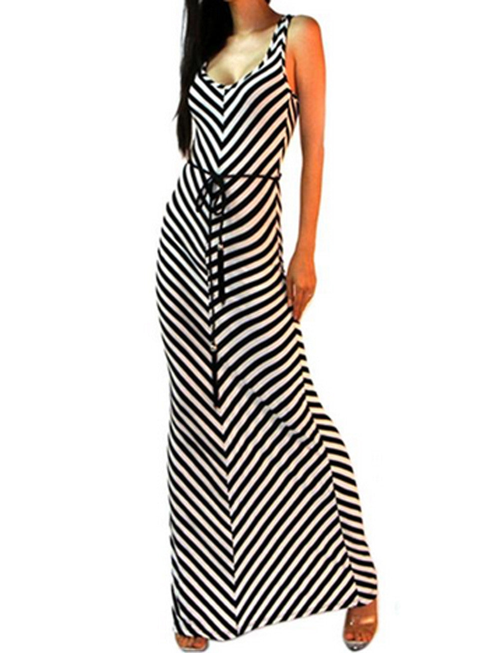 Black And White Striped Tank Sleeveless Women Long Maxi Dress Girl Casual 2016 Sundress Fashion Tassel Ladies Dress With Belt
