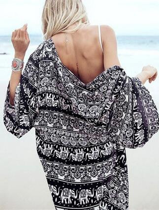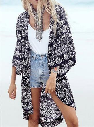 Boho Bohemian Print Open Blouse Women Kimono Long Shirt Chiffon Loose Blouse Cover Up Black Kimono Cardigan Casual Women Fashion