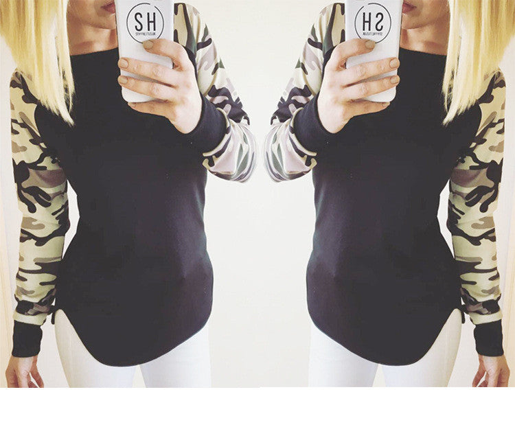 Camouflage Patchwork Full Sleeve Blouse O-Neck XXL Casual Slit Black Blouses 2016 Women New Arrival Casual Top