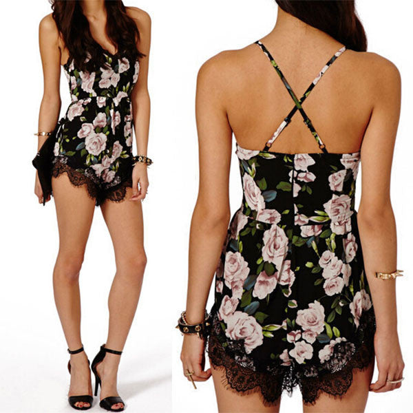 Casual Sexy Black Floral Jumpsuit Women Rompers Womens Jumpsuit Lace Trim Bodysuit Playsuit Onesie Macacao Feminino