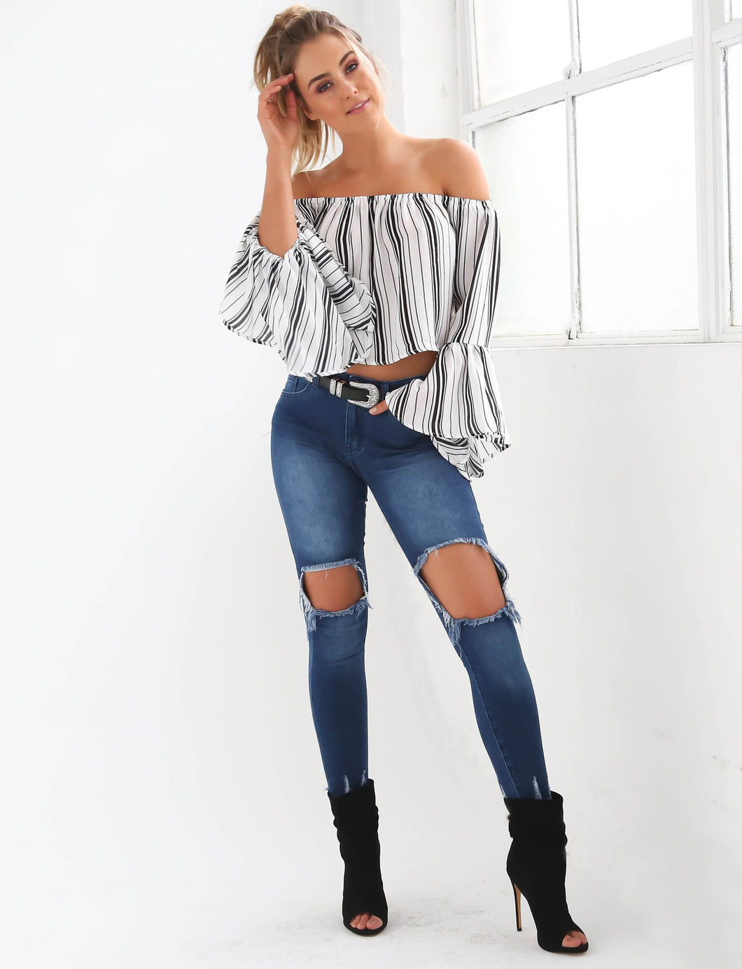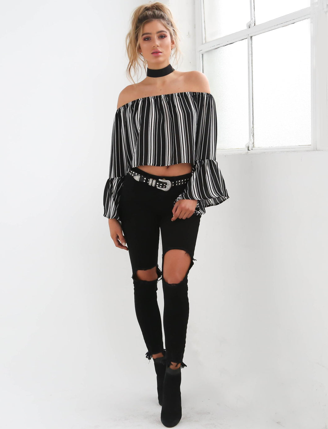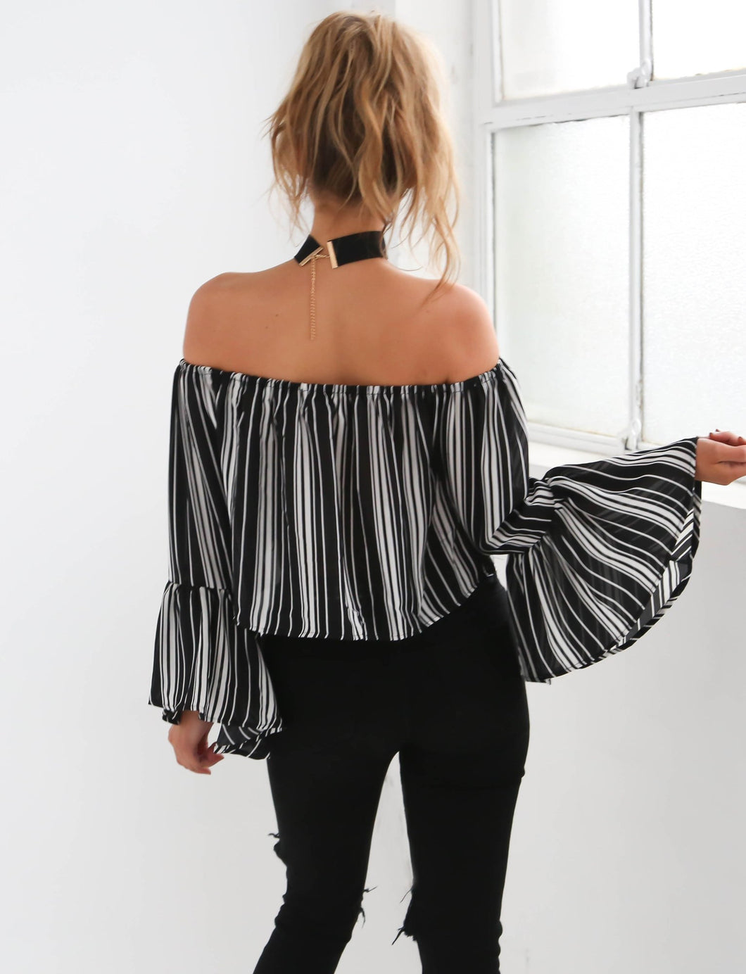 Choker Off Shoulder Full Sleeve Blouse Striped Print Trumpet Sleeve Black Blouses Women New Summer Fashion 2016 Short Blouse