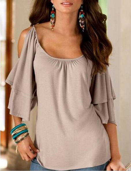 Cold Shoulder Double Ruffle Strap Women Blouse Summer Elegant Casual Girl Tops 2016 New Fashion New Arrival Women 2016