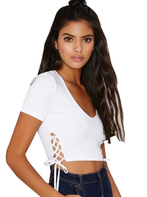Deep V Neck Low Cut Side Lace Up Bow Knot Crop Top Fashion Cropped Sexy Casual Club Black White 2 Color Women Shirt T Shirt Tee